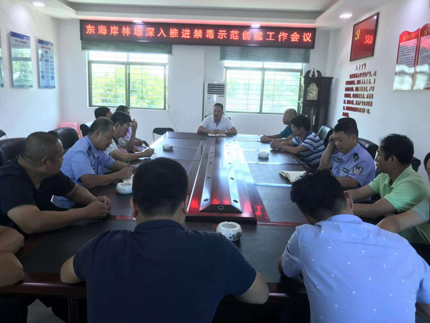 直东海岸林场召开驻场工作组人员、场领导班子及场全体职工会议,专门贯彻传达8月1日在甲子政府召开的陆丰市深入推进创建全国禁毒示范城市会议精神和8月3日甲东政府召开的禁毒创建推进及近期毒情通报会精神。
