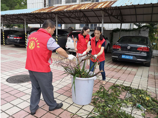 受强台风”山竹”影响,对pc蛋蛋(中国)开奖记录查询站造成巨大的损失。为积极响应市委市政府号召,以实际行动迅速参与救灾复产工作。9月17日一早,由陈紫光副局长带领市民政局救灾复产工作队队员,身穿志愿者服、手持铁愀、锄头等工具,前往市城区成业路口等处,清理路边堆积的垃圾、树枝等杂物,扶正并加固被台风吹倒的20多棵树木。