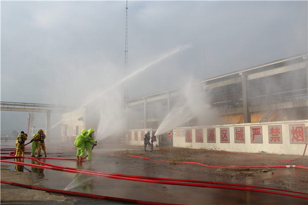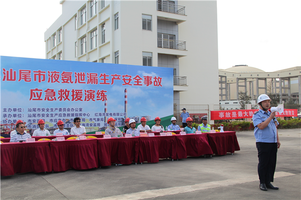 本次联合演练以危险化学品安全事故预警报知、组织指挥和抢险救援为演练重点。演练模拟红海湾发电有限公司工人操作不慎,发生液氨泄漏,演练根据灾情特点设置了侦检、堵漏、救助、断阀、水枪阵地转移等科目。接到警情后,消防支队迅速调集救援力量赶赴现场救援,并向市安委办报告请求启动《pc蛋蛋(中国)开奖记录查询站 危险化学品泄漏应急处置预案》,市安委办迅速调集安监、气象、环保、交警、卫计等相关联动到位到场协同处置。本次演练共调集了12辆消防车、1辆供电车、1辆医疗救护车、1辆应急指挥车,70余名消防指战员和社会联动单位人员,整个演练贴近实战,达到了预期效果。