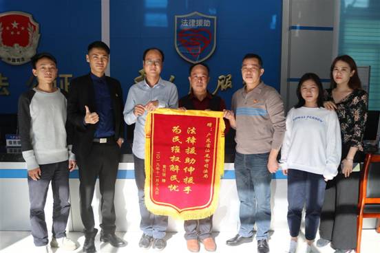 2019年11月23日下午,法律援助案件受援人黄某强来到市司法局公共法律服务大厅,送来一面写有“法律援助伸援手 为民维权解民忧”的锦旗。黄某强一边将锦旗送到法援工作人员的手中,一边对法援中心为他提供的帮助表示由衷地感谢。