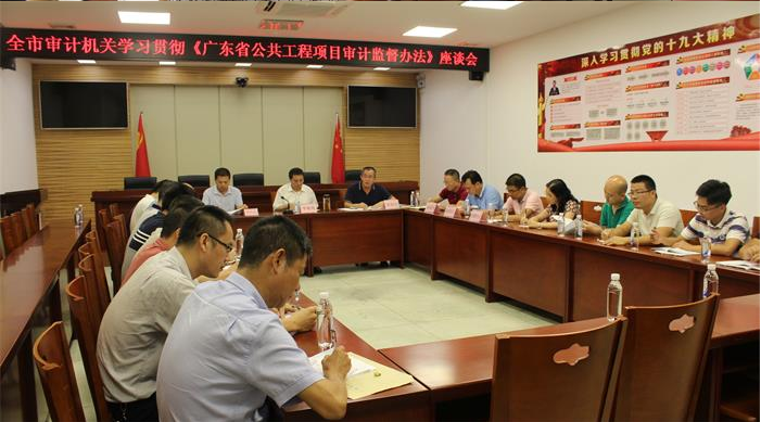 8月10日,根据市政府主要领导的批示精神,市审计局先后召开2场座谈会,组织市直各相关单位以及全市审计机关深入学习贯彻《广东省公共工程项目审计监督办法》。市发改局、市财政局、市国土局、市住建局、市规划局等14个单位的分管领导和负责公共工程业务科室负责人参加了上午的座谈会;各县(市、区)审计局局长、分管副局长和业务股室负责人参加了下午的座谈会。