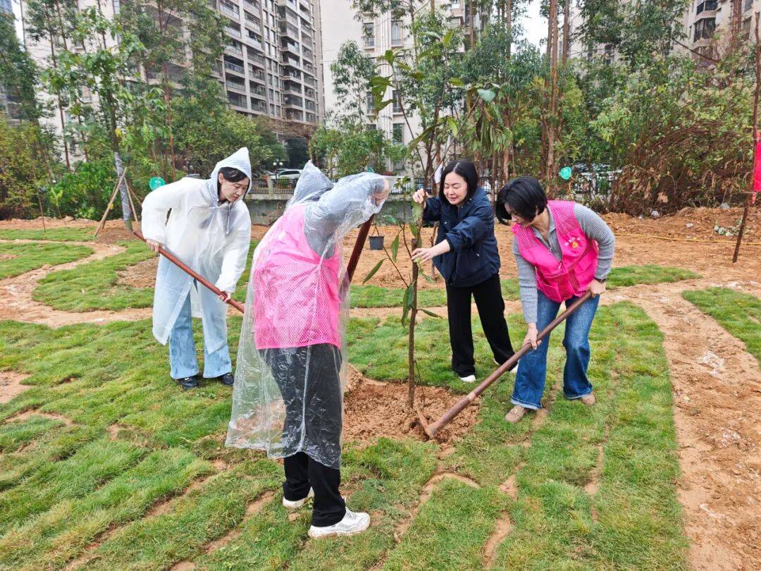 活动当天,细雨绵绵挡不住植绿热情,东海街道螺河东岸绿地一派热火朝天的景象。大家干劲十足,扶正树苗、挥锹铲土、培土围堰、提水浇灌……投入到紧张的植树劳动中。经过一番辛勤忙碌,新栽下的135株黄槿、澳洲火焰木、富贵榕、桃树、枇杷、香水柠檬等树苗在闲置绿地上错落有致,迎风挺立,焕发出勃勃生机,为大地增添新绿,更彰显了广大妇女投身“百千万工程”、共建家园的巾帼担。