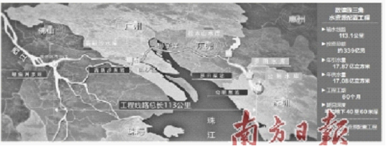 如此意义重大的调水工程未来将建成什么样?据国家发改委批文显示,珠三角水资源配置工程由一条干线、两条分干线、一条支线、三座泵站和一座新建调蓄水库组成。工程西起西江干流鲤鱼洲,东至深圳公明水库,以深层管道输水方式穿越珠三角核心城市群。