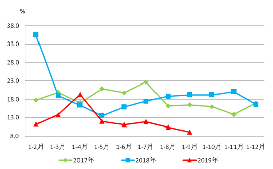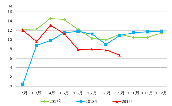 图2 2017年-2019年前三季度pc蛋蛋 固定资产投资增速曲线图