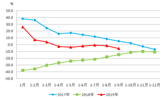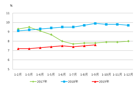 图1 2017-2019年前三季度pc蛋蛋 规模以上工业增加值增速曲线图