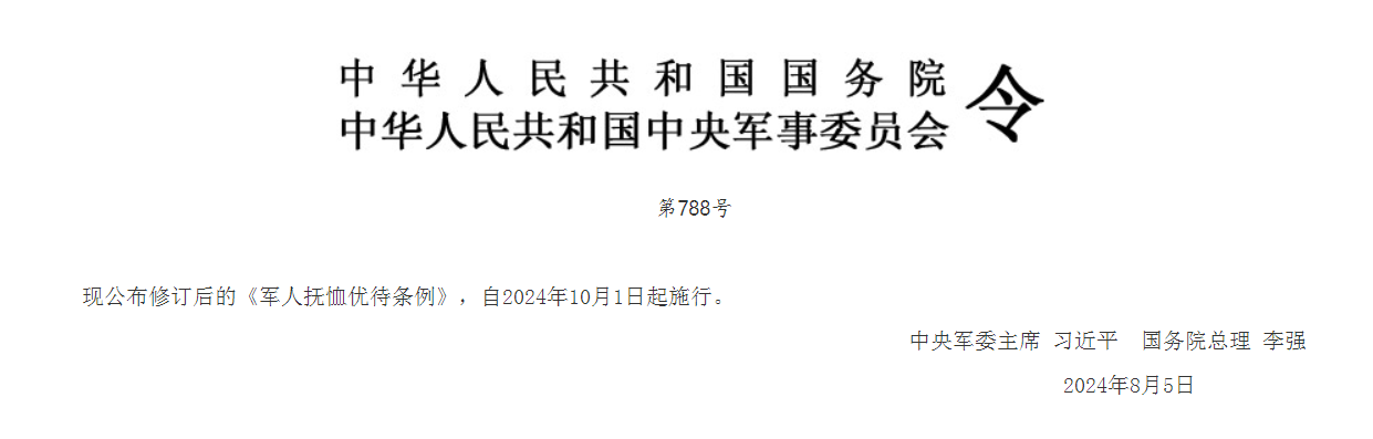 军人抚恤优待条例 (2004年8月1日中华人民共和国国务院、中华人民共和国中央军事委员会令第413号公布 根据2011年7月29日《国务院、中央军事委员会关于修改〈军人抚恤优待条例〉的决定》第一次修订 根据2019年3月2日《国务院关于修改部分行政法规的决定》第二次修订 2024年8月5日中华人民共和国国务院、中华人民共和国中央军事委员会令第788号第三次修订) 第一章 总 则 第一条为了保障国家对军人的抚恤优待,激励军人保卫祖国、建设祖国的献身精神,加强国防和军队现代化建设,让军人成为全社会尊崇的职业,根据《中华人民共和国国防法》、《中华人民共和国兵役法》、《中华人民共和国军人地位和权益保障法》、《中华人民共和国退役军人保障法》等有关法律,制定本条例。 第二条本条例所称抚恤优待对象包括: (一)军人; (二)服现役和退出现役的残疾军人; (三)烈士遗属、因公牺牲军人遗属、病故军人遗属; (四)军人家属; (五)退役军人。 第三条军人抚恤优待工作坚持中国共产党的领导。 军人抚恤优待工作应当践行社会主义核心价值观,贯彻待遇与贡献匹配、精神与物质并重、关爱与服务结合的原则,分类保障,突出重点,逐步推进抚恤优待制度城乡统筹,健全抚恤优待标准动态调整机制,确保抚恤优待保障水平与经济社会发展水平、国防和军队建设需要相适应。 第四条国家保障抚恤优待对象享受社会保障和基本公共服务等公民普惠待遇,同时享受相应的抚恤优待待遇。 在审核抚恤优待对象是否符合享受相应社会保障和基本公共服务等条件时,抚恤金、补助金和优待金不计入抚恤优待对象个人和家庭收入。 第五条国务院退役军人工作主管部门负责全国的军人抚恤优待工作;县级以上地方人民政府退役军人工作主管部门负责本行政区域内的军人抚恤优待工作。 中央和国家有关机关、中央军事委员会有关部门、地方各级有关机关应当在各自职责范围内做好军人抚恤优待工作。 第六条按照中央与地方财政事权和支出责任划分原则,军人抚恤优待所需经费主要由中央财政负担,适度加大省级财政投入力度,减轻基层财政压力。 县级以上地方人民政府应当对军人抚恤优待工作经费予以保障。 中央和地方财政安排的军人抚恤优待所需经费和工作经费,实施全过程预算绩效管理,并接受财政、审计部门的监督。 第七条国家鼓励和引导群团组织、企业事业单位、社会组织、个人等社会力量依法通过捐赠、设立基金、志愿服务等方式为军人抚恤优待工作提供支持和帮助。 全社会应当关怀、尊重抚恤优待对象,开展各种形式的拥军优属活动,营造爱国拥军、尊崇军人浓厚氛围。 第八条国家推进军人抚恤优待工作信息化,加强抚恤优待对象综合信息平台建设,加强部门协同配合、信息共享,实现对抚恤优待对象的精准识别,提升军人抚恤优待工作服务能力和水平。 国家建立享受定期抚恤补助对象年度确认制度和冒领待遇追责机制,确保抚恤优待资金准确发放。 第九条对在军人抚恤优待工作中做出显著成绩的单位和个人,按照国家有关规定给予表彰和奖励。 第二章 军人死亡抚恤 第十条烈士遗属享受烈士褒扬金、一次性抚恤金,并可以按照规定享受定期抚恤金、丧葬补助、一次性特别抚恤金等。 因公牺牲军人遗属、病故军人遗属享受一次性抚恤金,并可以按照规定享受定期抚恤金、丧葬补助、一次性特别抚恤金等。 第十一条军人牺牲,符合下列情形之一的,评定为烈士: (一)对敌作战牺牲,或者对敌作战负伤在医疗终结前因伤牺牲的; (二)因执行任务遭敌人或者犯罪分子杀害,或者被俘、被捕后不屈遭敌人杀害或者被折磨牺牲的; (三)为抢救和保护国家财产、集体财产、公民生命财产或者执行反恐怖任务和处置突发事件牺牲的; (四)因执行军事演习、战备航行飞行、空降和导弹发射训练、试航试飞任务以及参加武器装备科研试验牺牲的; (五)在执行外交任务或者国家派遣的对外援助、维持国际和平任务中牺牲的; (六)其他牺牲情节特别突出,堪为楷模的。 军人在执行对敌作战、维持国际和平、边海防执勤或者抢险救灾等任务中失踪,被宣告死亡的,按照烈士对待。 评定烈士,属于因战牺牲的,由军队团级以上单位政治工作部门批准;属于非因战牺牲的,由军队军级以上单位政治工作部门批准;属于本条第一款第六项规定情形的,由中央军事委员会政治工作部批准。 第十二条军人死亡,符合下列情形之一的,确认为因公牺牲: (一)在执行任务中、工作岗位上或者在上下班途中,由于意外事件死亡的; (二)被认定为因战、因公致残后因旧伤复发死亡的; (三)因患职业病死亡的; (四)在执行任务中或者在工作岗位上因病猝然死亡的; (五)其他因公死亡的。 军人在执行对敌作战、维持国际和平、边海防执勤或者抢险救灾以外的其他任务中失踪,被宣告死亡的,按照因公牺牲对待。 军人因公牺牲,由军队团级以上单位政治工作部门确认;属于本条第一款第五项规定情形的,由军队军级以上单位政治工作部门确认。 第十三条军人除本条例第十二条第一款第三项、第四项规定情形以外,因其他疾病死亡的,确认为病故。 军人非执行任务死亡,或者失踪被宣告死亡的,按照病故对待。 军人病故,由军队团级以上单位政治工作部门确认。 第十四条军人牺牲被评定为烈士、确认