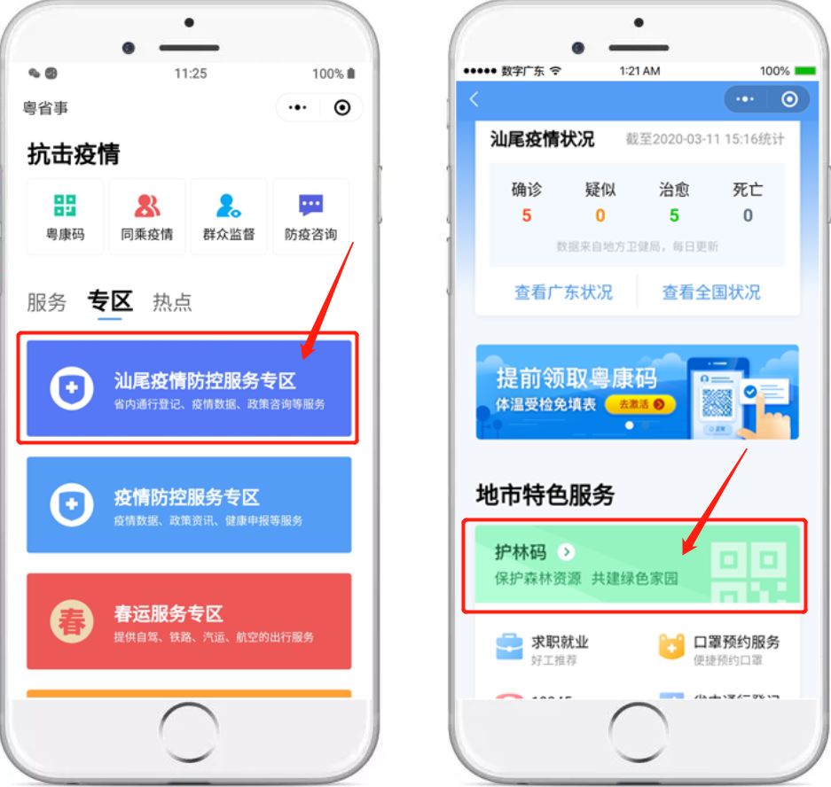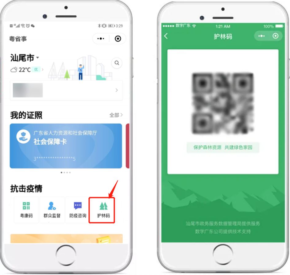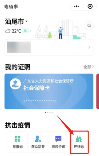 (1)从微信小程序pc蛋蛋进入:微信搜索“粤省事”小程序,pc蛋蛋左上角切换城市为pc蛋蛋 /云浮,下滑在“抗击疫情”版块找到“护林码”服务。