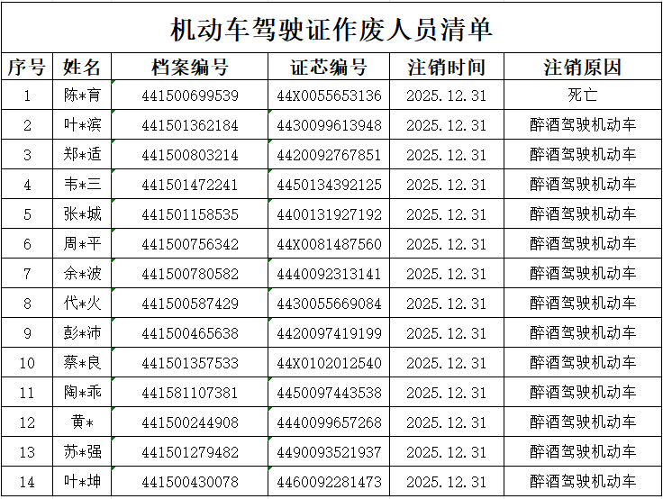 根据《机动车驾驶证申领和使用规定》(中华人民共和国公安部令第172号令)第七十九条、第八十条之规定,2025年12月份对下列人员机动车驾驶证依法予以注销、吊销,现公告作废。