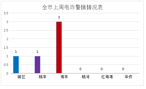 上周电诈警情中,城区警情发生在新港街道;海丰警情发生在城东镇、公平镇和海城镇;陆丰警情发生在碣石镇;以上镇街电诈警情发生均为1起。