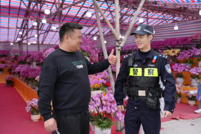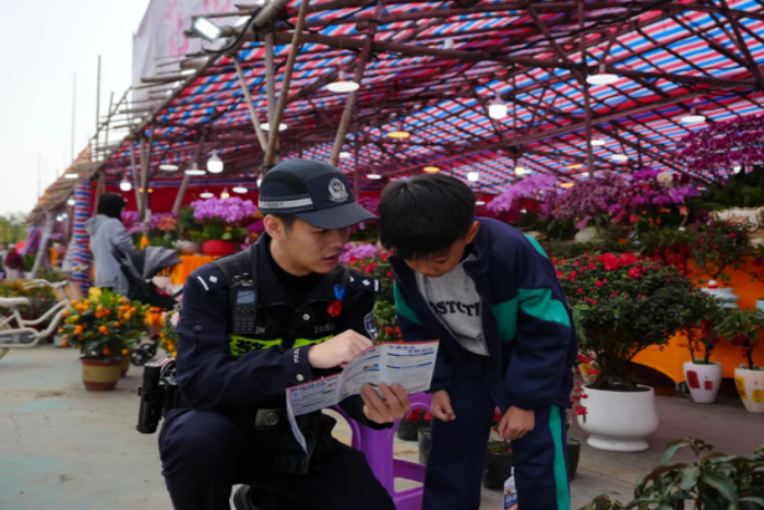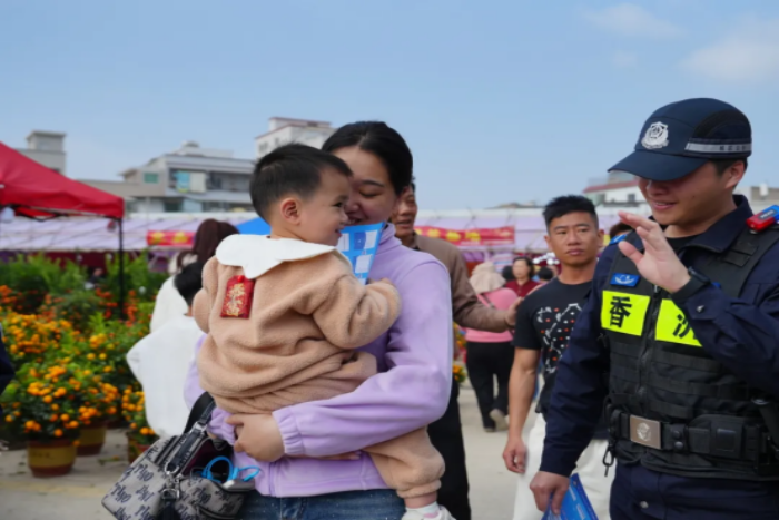 清晨的年货市集、新春花市,人头攒动、烟火升腾,社区民警融入市集人流,组成“平安宣传小分队”,穿梭在摊位之间。“快过年了,热闹的地方要记得看好随身财物。”“做生意赚钱不容易,一定要警惕各种诈骗手段,不要随意转账。”