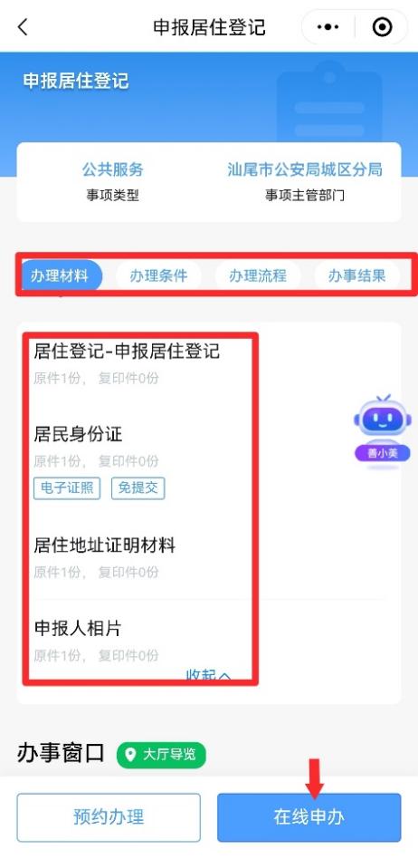 第三步:进入业务办理页面,可以查阅办理材料、办理条件、办理流程、办理结果等信息,点击右下角【在线申办】。