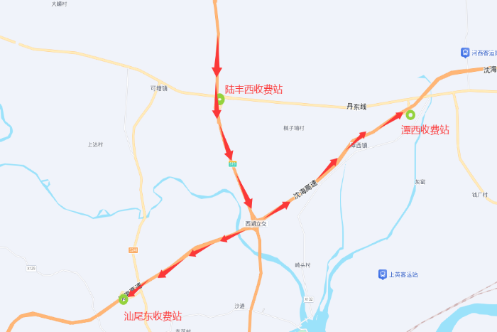 陆丰西收费站→右转驶入G228国道(行驶约9公里)→从潭西站驶入沈海高速。