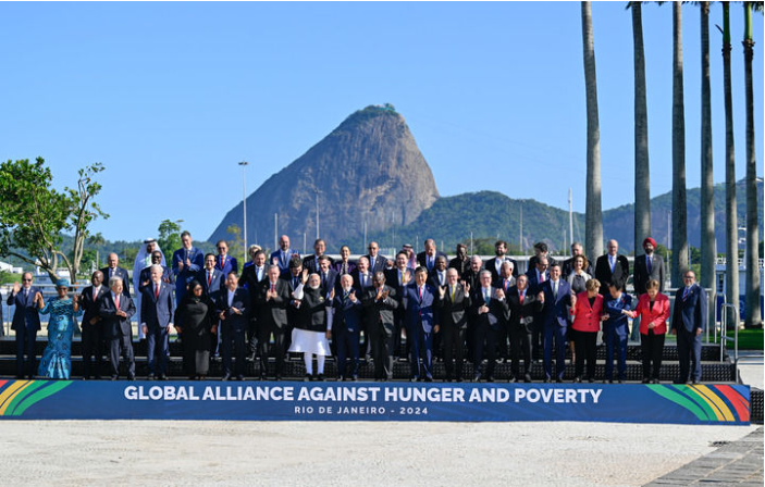 当地时间11月18日上午,国家主席习近平在巴西里约热内卢出席二十国集团领导人第十九次峰会。峰会把“构建公正的世界和可持续的星球”作为主题,并决定成立“抗击饥饿与贫困全球联盟”。这是习近平同与会领导人共同参加巴方发起的“抗击饥饿与贫困全球联盟”合影。新华社记者 李学仁 摄