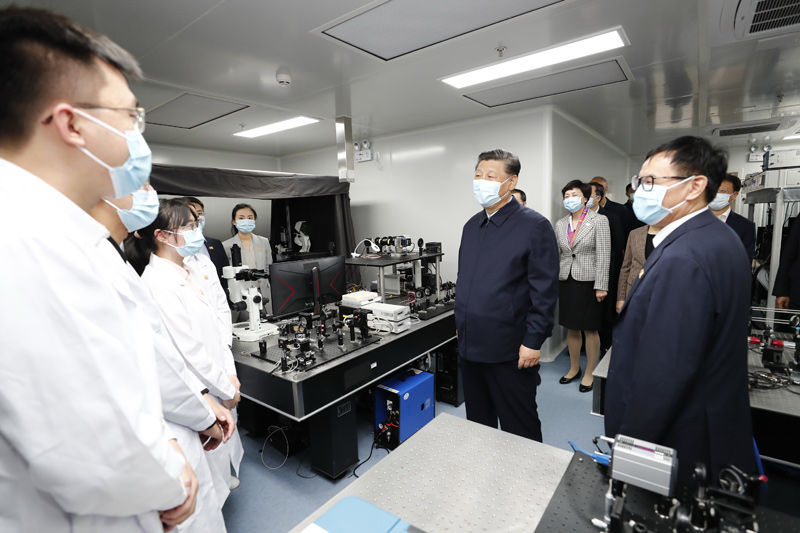 听取实验室理论研究、技术攻关、成果转化应用等情况介绍。新华社记者 鞠鹏 摄