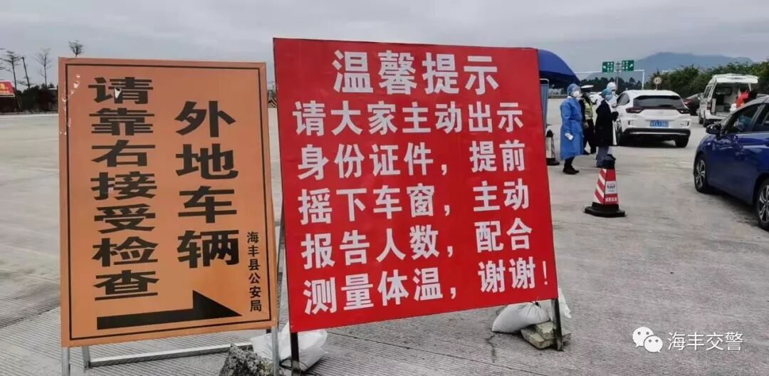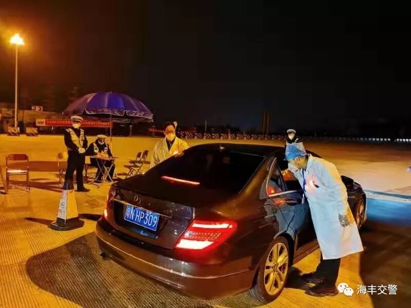 疫情蔓延期间,在辖区内重要路段检查点,医生、公安、交通、住建等联合检查工作人员将持续全力控制新型冠状病毒传播蔓延途径,积极投入疫情联防联控工作第一线,开展过往人员体温监测,请广大驾驶人积极配合海丰公安交警以及各职能部门的疫情防控工作,自觉排队、服从指挥、耐心等待。