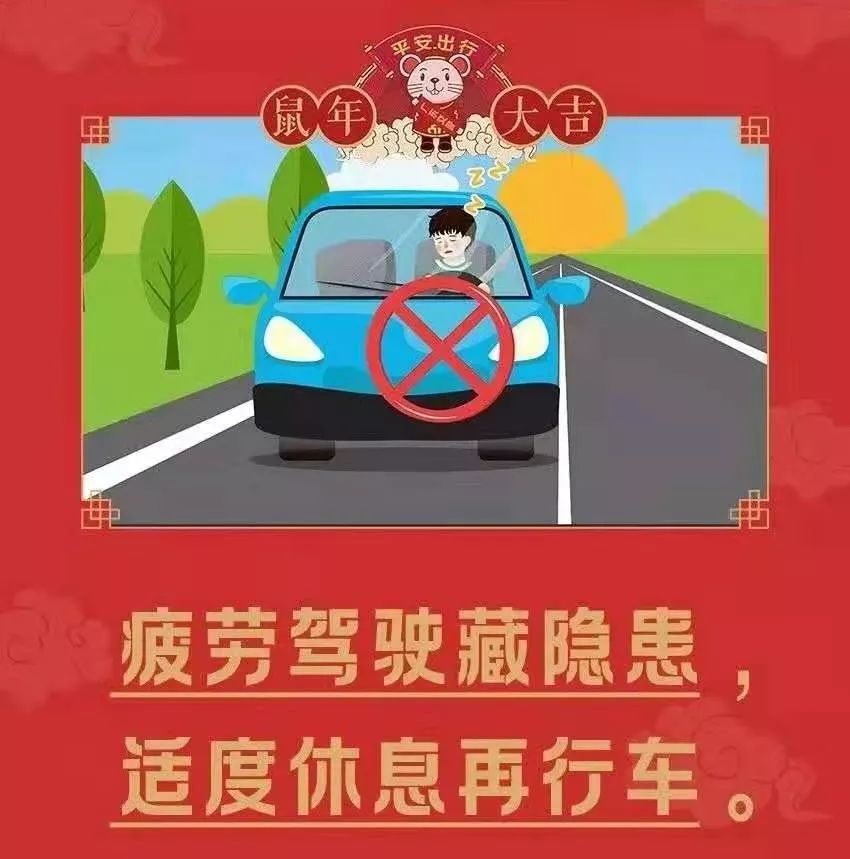 疲劳驾驶会导致判断力下降、反应迟钝,加大操作失误风险。驾车出行,请合理安排好休息时间,确保睡眠充分,连续驾驶不超过4小时,停车休息不少于30分钟。若感觉困倦、状态不佳,请选择安全地点停车休息。