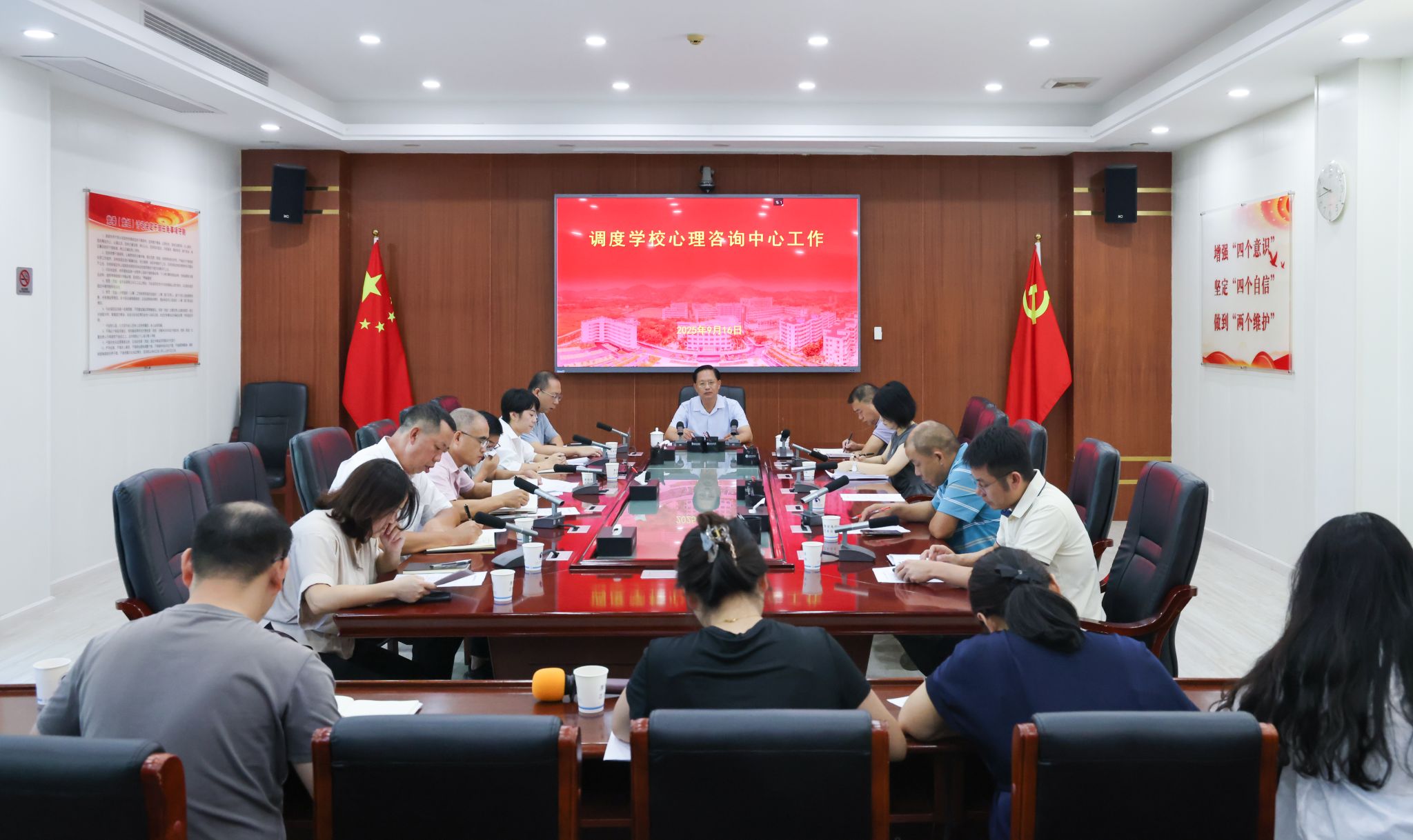 为提升学校学生心理健康工作水平,9月16日上午,学校党委书记林来平在科学楼三楼会议室调度学校心理咨询中心工作,并对学校2025年秋季学期心理危机防范工作会议进行指导。学校党委副书记吴方晖参加调度。学生处负责人、各学院党总支书记、学生处相关人员及心理辅导员参加调度。