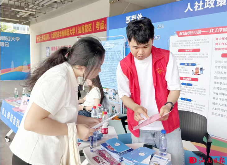 招聘会现场,工作人员为高校毕业生解读相关政策。