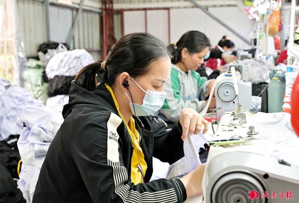 陆河各企业纷纷吹响复工复产“集结号”,开足马力赶订单、忙生产。图为城南电商园服装企业工人在车间生产。