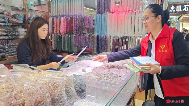 工作人员向可塘珠宝交易市场的商户派发版权保护宣传资料。