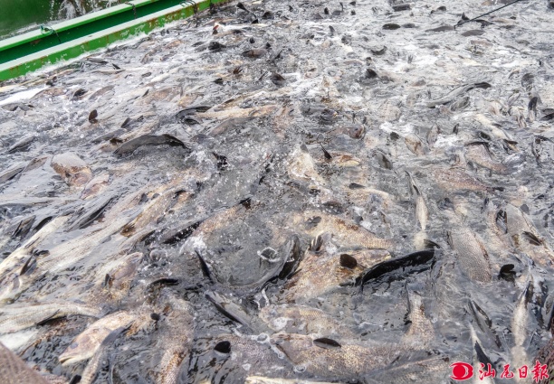 工作人员对渔船上的鱼苗拉网送入投放管道。 pc蛋蛋 日报记者 许楚璇 摄