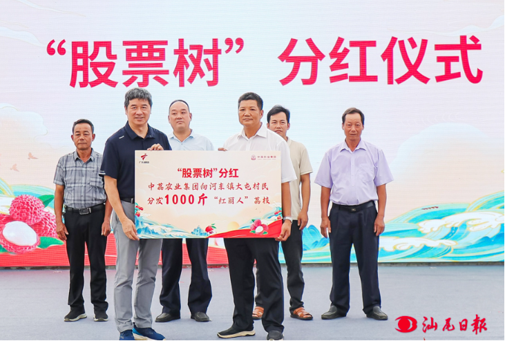 活动中亮点频出,精彩不断,“红丽人”“迟美人”两大荔枝新品正式发布;文艺工作者、非遗传承人等获授“陆丰荔枝文化推广大使”称号;荔枝出口基地揭牌。其中,“股票树”分红仪式尤为引人注目,会上河东镇大屯村村民作为首批受益者现场领取分红,还公布了升级版的“股票树 2.0”模式。该模式通过资源整合与风险共担,进一步拓宽了农民增收渠道。“盼了3年,今天收到‘股票树’的分红很开心,看到大家都在推广我们种的荔枝,心里很激动,希望日子能越来越好。”河东镇大屯村村民话语难掩喜悦之情。
