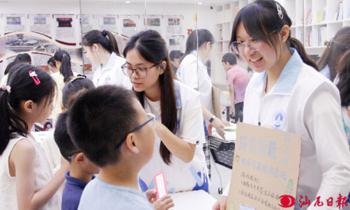图为小学生向伴学师了解“海洋污染防治密码”。