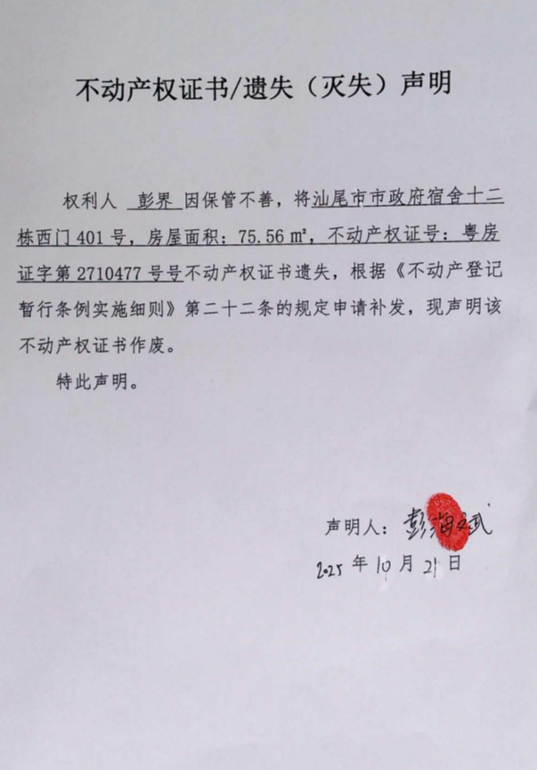 不动产权证书遗失(灭失)声明(彭界)