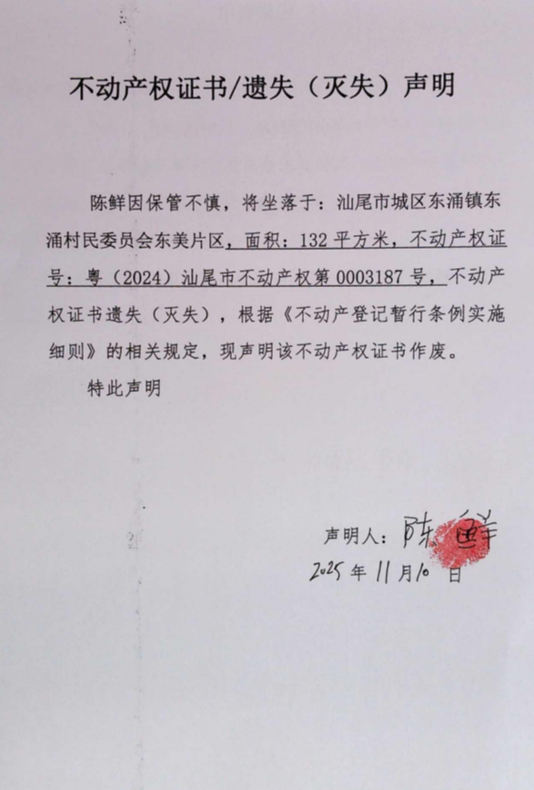 不动产权证书遗失(灭失)声明(陈鲜)