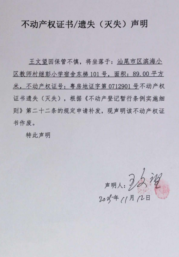 不动产权证书遗失(灭失)声明(王文望)