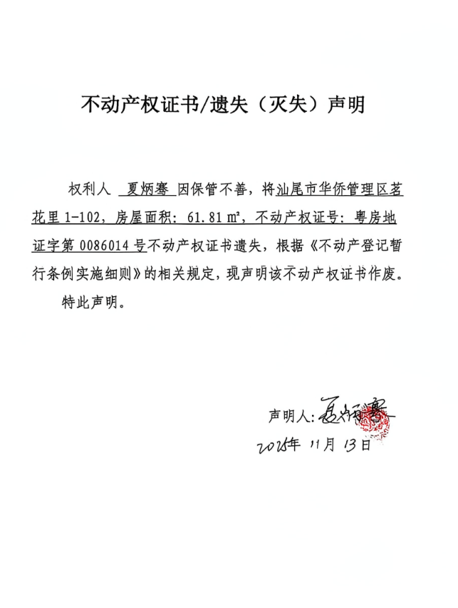 不动产权证书遗失(灭失)声明(夏炳骞)