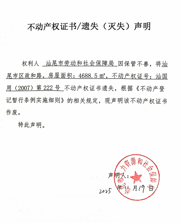 不动产权证书遗失(灭失)声明(pc蛋蛋(中国)开奖记录查询站 劳动和社会保障局)