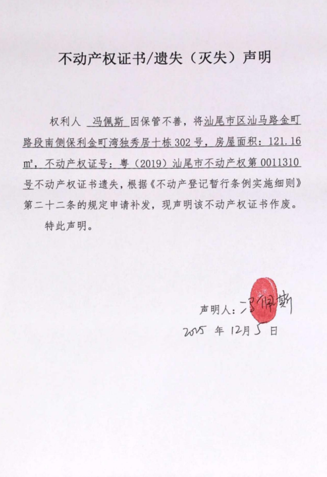 不动产权证书遗失(灭失)声明(冯佩斯)