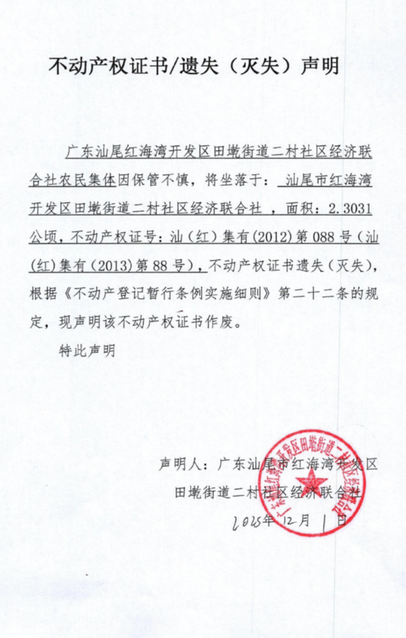 不动产权证书遗失(灭失)声明(广东pc蛋蛋 红海湾经济开发区田墘街道二村社区经济联合社农民集体)