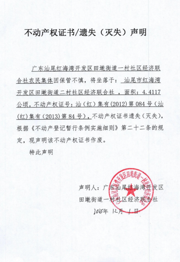 不动产权证书遗失(灭失)声明(广东pc蛋蛋 红海湾开发区田墘街道一村社区经济联合社农民集体)