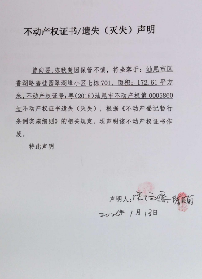 不动产权证书遗失(灭失)声明(陈秋菊、曾向要)