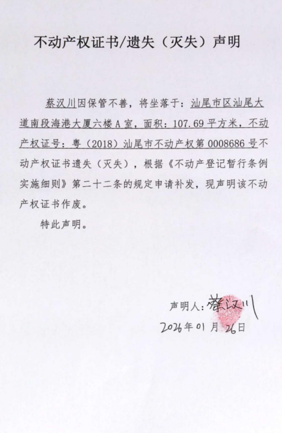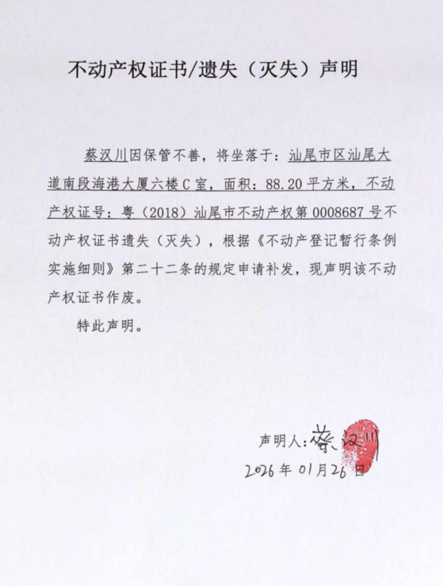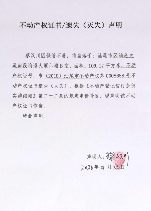 不动产权证书遗失(灭失)声明(蔡汉川三宗)