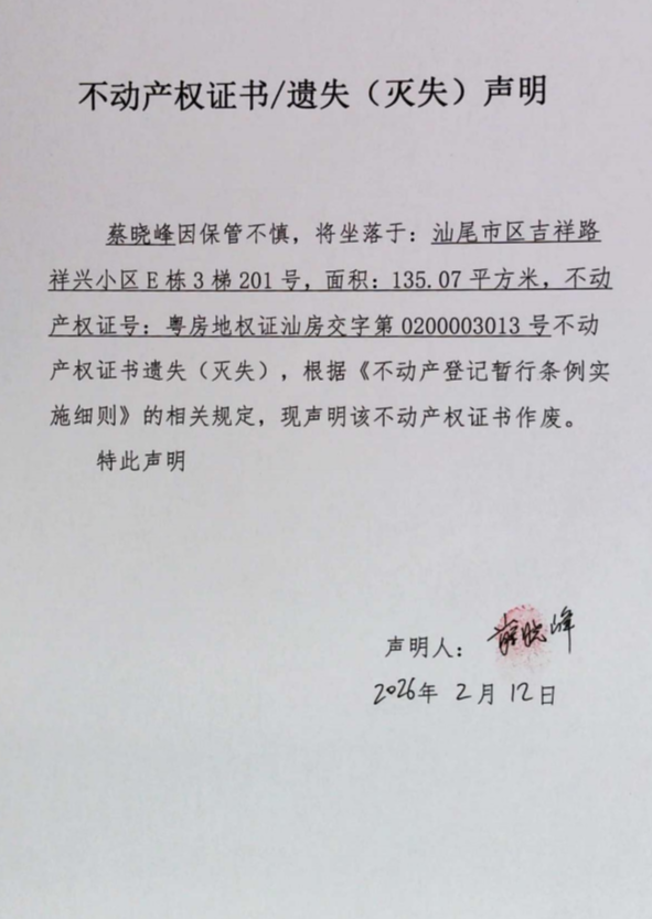 不动产权证书遗失(灭失)声明(蔡晓峰)