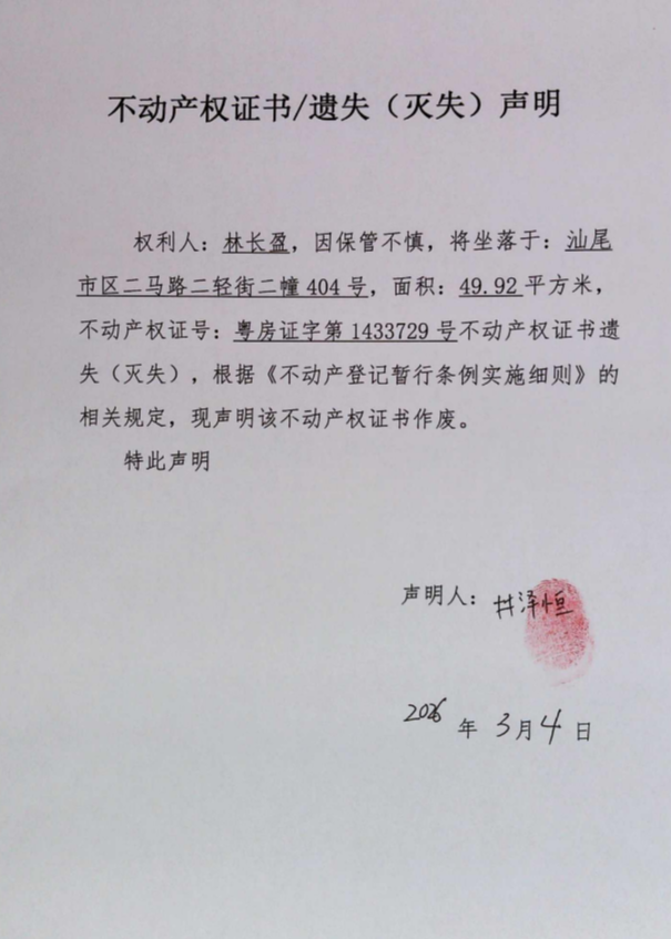 不动产权证书遗失(灭失)声明(林长盈)