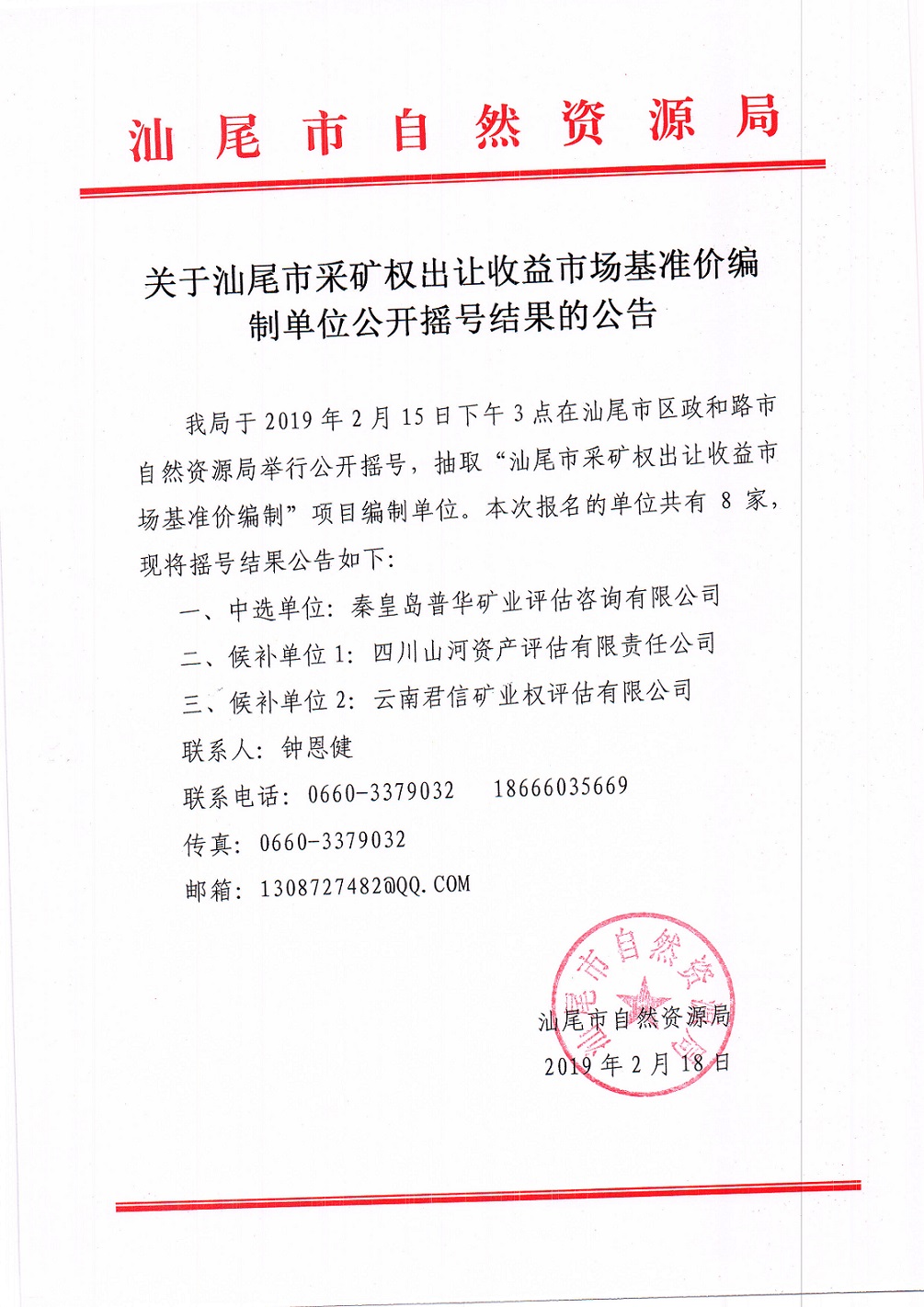 关于pc蛋蛋(中国)开奖记录查询站 采矿权出让收益市场基准价编制单位公开摇号结果的公告