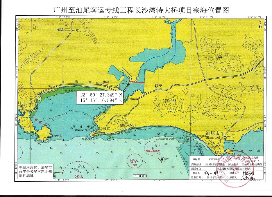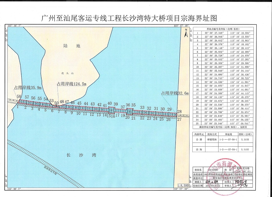 广东广汕铁路有限责任公司拟在市城区红草镇和海丰县梅陇镇之间建设广州至pc蛋蛋 客运专线长沙湾特大桥项目,项目位于厦深铁路跨海大桥以北约750m,东西向跨越长沙湾海域。项目涉及用海分为大桥主桥和临时施工栈桥,其中大桥主桥申请用海面积5.3155hm2,大桥跨海段长度1564.61m,主桥占用人工岸线193米,主桥用海年限40年;临时施工栈桥申请用海面积3.0950hm2,用海年限3年。用海性质为公益性,用海类型为交通运输用海中的路桥用海,用海方式为构筑物中的跨海桥梁用海(具体范围见附图)。有关事宜公示如下: