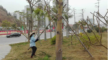 二、做好日常绿化养护工作。巡查市区各路段,对不规范的行道树支架做法进行清查,对金湖路、成业路、公园路、湖滨大道、海滨大道、香洲路等路段拨除行道树上的铁钉,并做全新的符合规范的行道树支架。