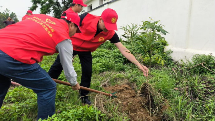 4月23日,陆丰分局结合党建活动,在潭西镇深港村开展了“珍爱地球,人与自然和谐共生”为主题的植树活动暨世界地球日主题宣传。在党旗的引领下,陆丰分局志愿者们干劲十足,挽起袖子,拿起铁锹,充分发挥生态环保铁军不怕苦不怕累的精神,互相配合,挖坑、扶树、填土、踩实、浇水,每道工序都一丝不苟、认真细致,一颗颗新栽的树木迎风挺立,展现出勃勃生机,用实际行动为陆丰生态环境再添新绿。同时,陆丰分局人员向来往的村民发放环保知识宣传资料,热情宣讲保护环境的意义,向村民们宣传不用一次性塑料用具、不乱丢垃圾、随手关灯、节约用水用纸、购买节能电器、拒绝过度包装、保护生物多样性、参与植树、出行尽量使用绿色交通工具等倡议。