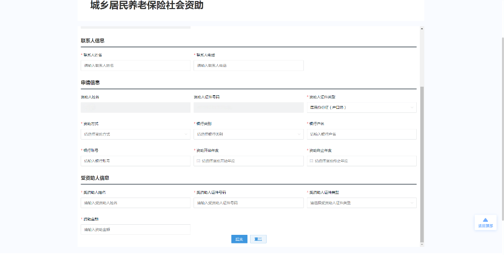 步骤二:根据申办页面的表单提示信息,补充完善联系人信息、申请信息和受资助人信息,核对确认银行账号、资助年度和受资助人信息无误后,点击提交并上传材料即完成业务申办。