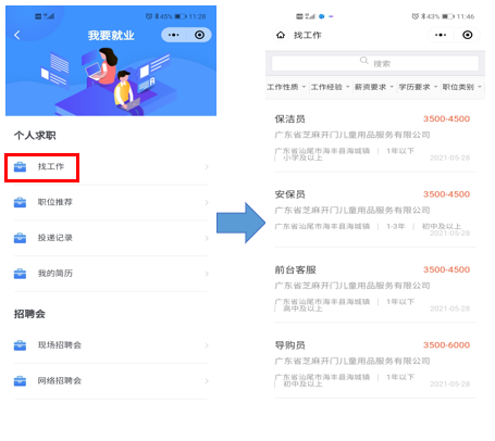 除了可以在“我要就业”上投简历、找工作,求职者还可以通过招聘会栏目了解更多招聘会信息,参加网络招聘会。同时,“我要就业”还提供了一系列的公共就业服务,包括就业机构、就业扶贫、高校毕业生补贴、南粤家政、就业创业补贴等政策指引和办事指南。