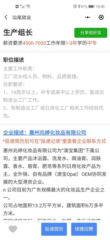 找到心仪的职位,可以选择“快捷应聘”直接表达求职意向,或者选择“投递简历”向企业投递完整简历。