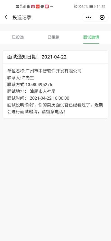 在提交完简历后耐心等待企业的邀约面试,你会收到电话邀约或在“pc蛋蛋 就业”就业小程序中收到现场面试或远程视频面试通知。