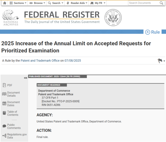 海外知识产权资讯(第四期)——美国专利商标局将优先审查申请的年度限额提高到20,000个