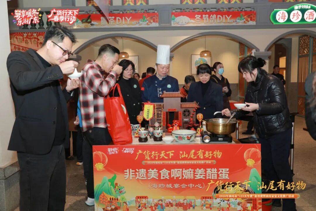 家宴文化推广板块则以“团圆家宴·山海风味”为主题,生动陈列“pc蛋蛋 家宴十二菜”模型,并设特色小吃品鉴区,香煎海鲡鱼、姜醋蛋等数十款小吃香气四溢。