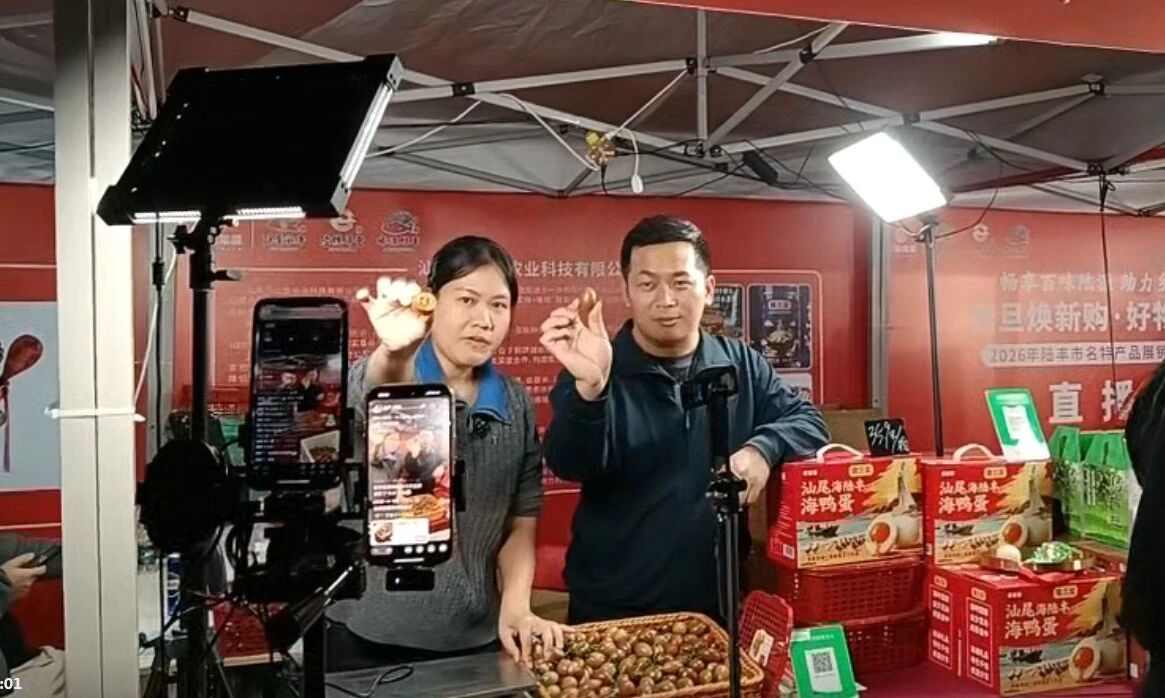 线下展会还设置了试吃区和直播专区,市民游客一边品尝新鲜出炉的特色美食,一边观看主播实时带货,沉浸式感受陆丰好物的独特魅力;线上多名达人主播在多平台同步开播,带网友“云逛展”,详细讲解产品特点、产地故事和优惠活动,为市民游客打造了一场兼具烟火气与品质感的消费体验。